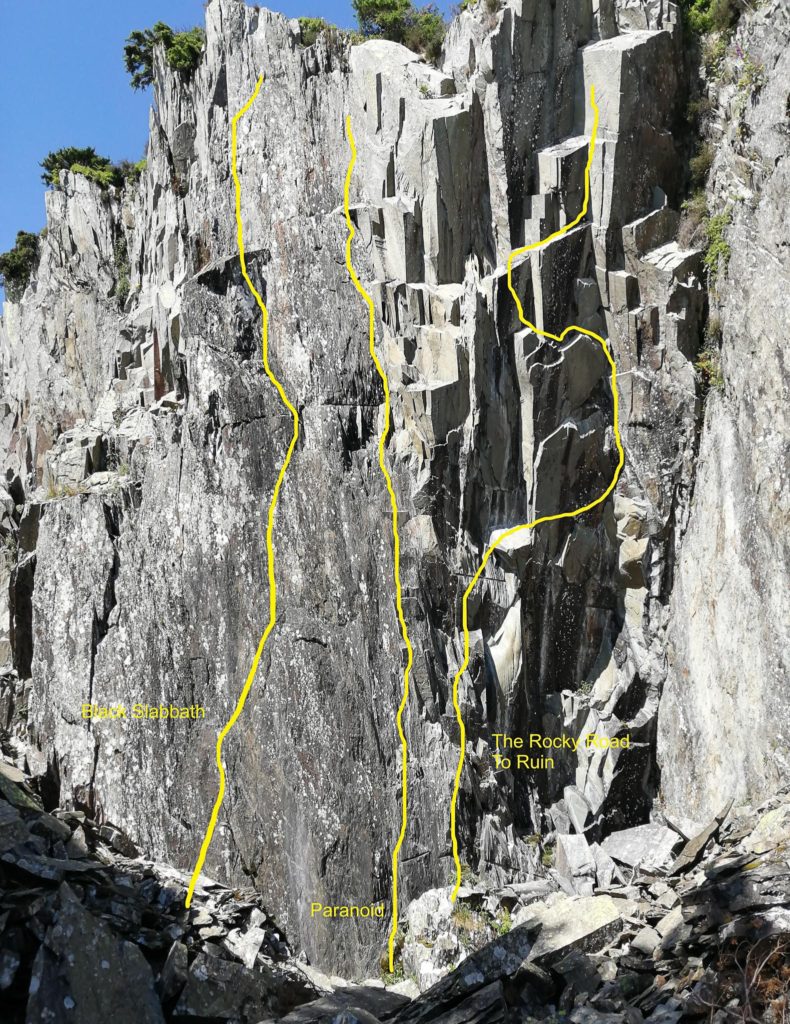 The eye catching wall, as seen as entering the middle quarry, has yielded three routes. Black Slabbath takes the left hand line.