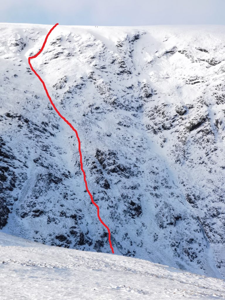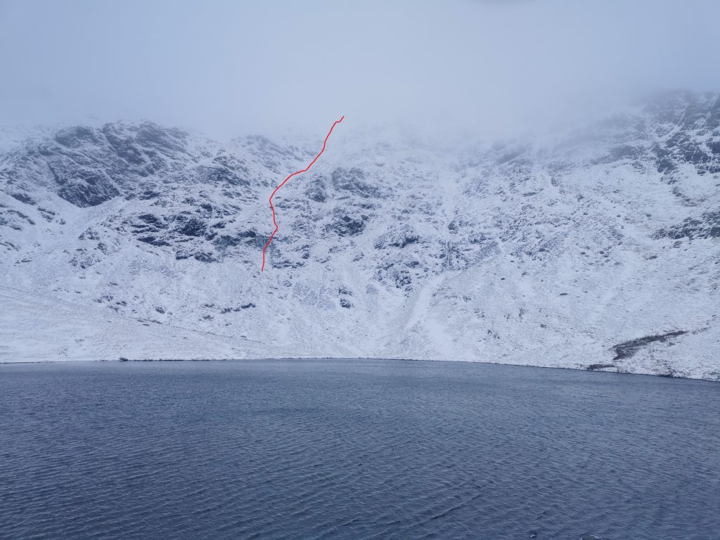 Start from Scales Tarn up the easy line of ice beneath the right hand ice fall, climb ice fall on right, follow open gully system to top. Its left of Slip Mix Up , up the middle of Tarn Crag. Take any difficulties direct to increase grade. Suspect easily banked out in old fashioned snow but now it may occur more often