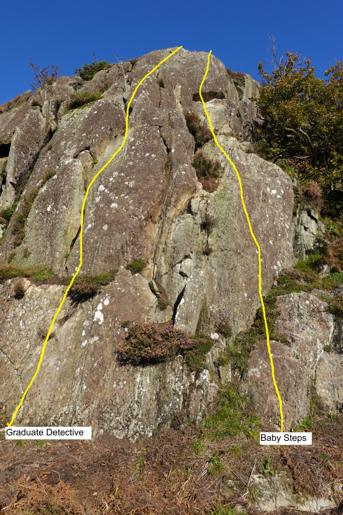 Posted by: Dave Geere, 25.03.202620.03.2026, Dave Geere, Owain Clark, John L Holden Right of the block chimney of Little Norm the crag starts to face South West. Climb a short wall to a prominent cracked groove which leads to a spacious ledge. Arrange some protection on the large flake on the left and climb the short technical wall bearing right to the top. An easier alternative would be to climb up and left from the flake making the route HS(4b) See Topo
