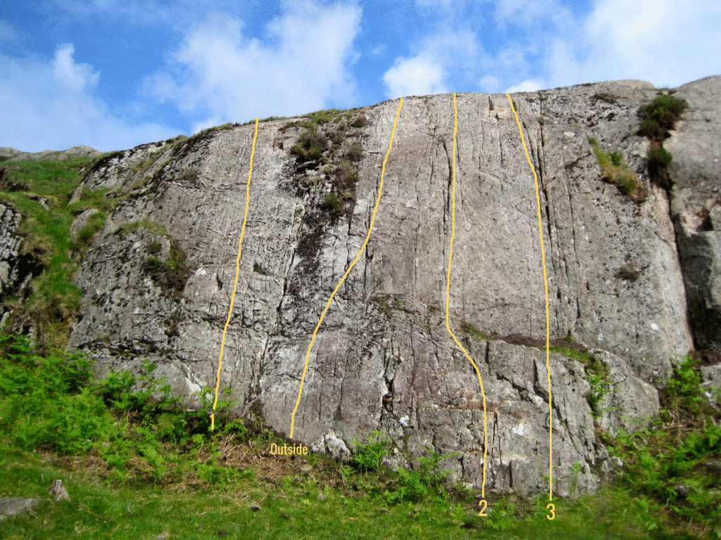 Posted by: Paul Bennett, 12.06.202207.06.2022, Paul C Bennett & Dick Baker 2. Start 1.5m to the right of Outside In. Climb to the left side of a ledge to follow flakes and cracks to the top.