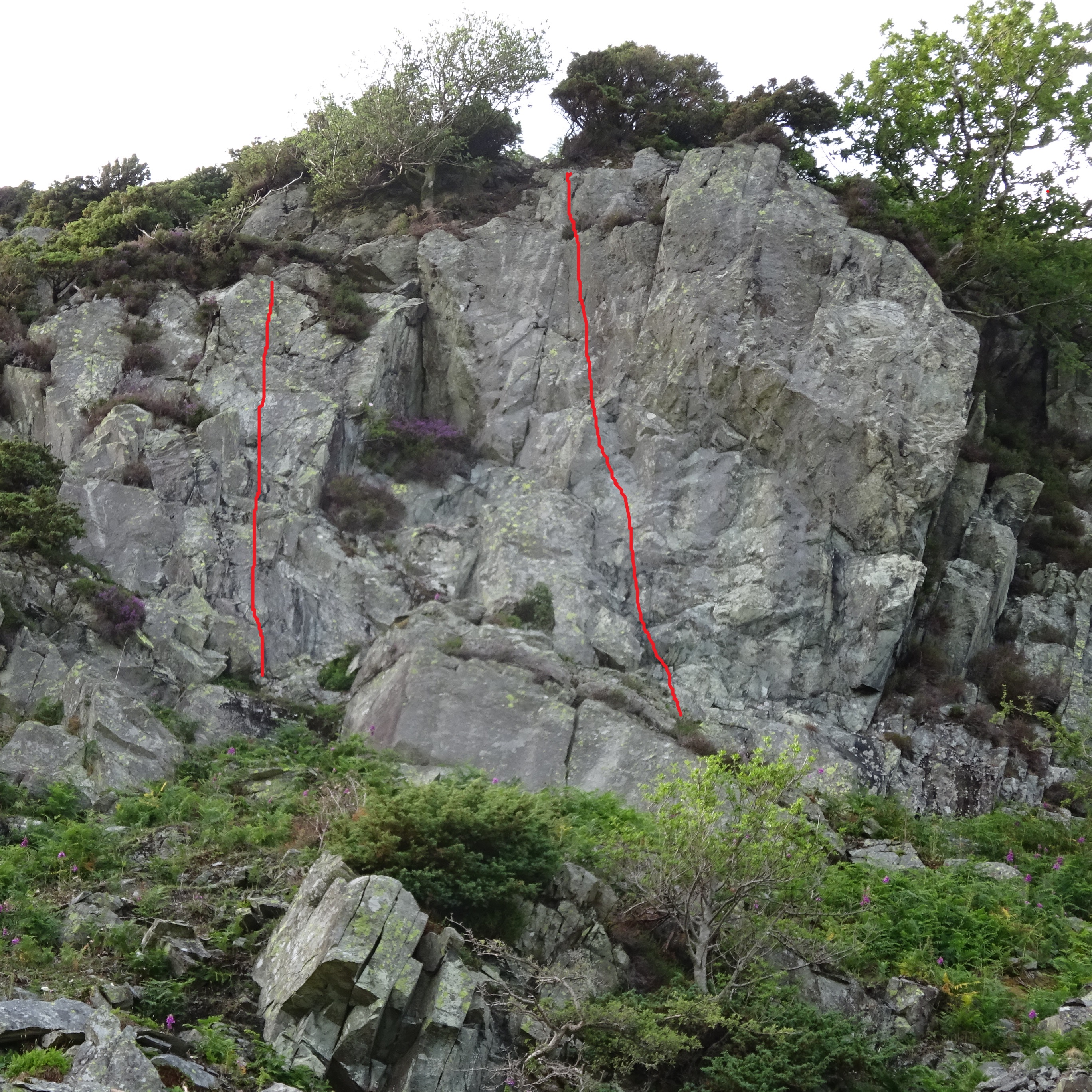 The isolated buttress 50 meters right (east) of the Tower of Power area now provides two short routes. Start in the centre of the buttress by a large protruding spike. Climb the steep wall leftwards on large holds to gain a thin vertical crack. A high step up leads to plentiful juniper belays.