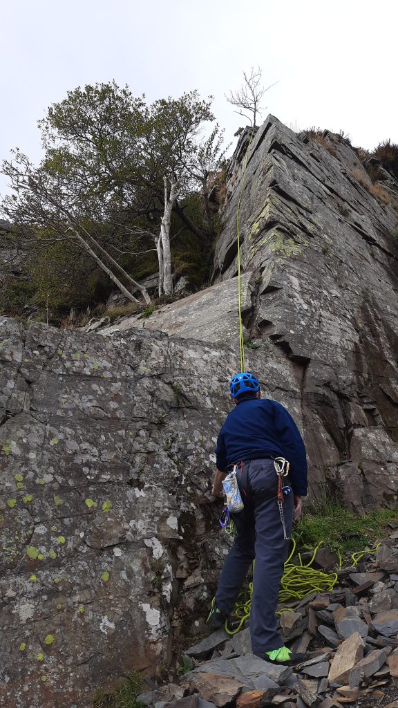 Start as for “Crestfallen” climbing towards the tree on the first ledge, then climb the slabby wall above on thin holds.