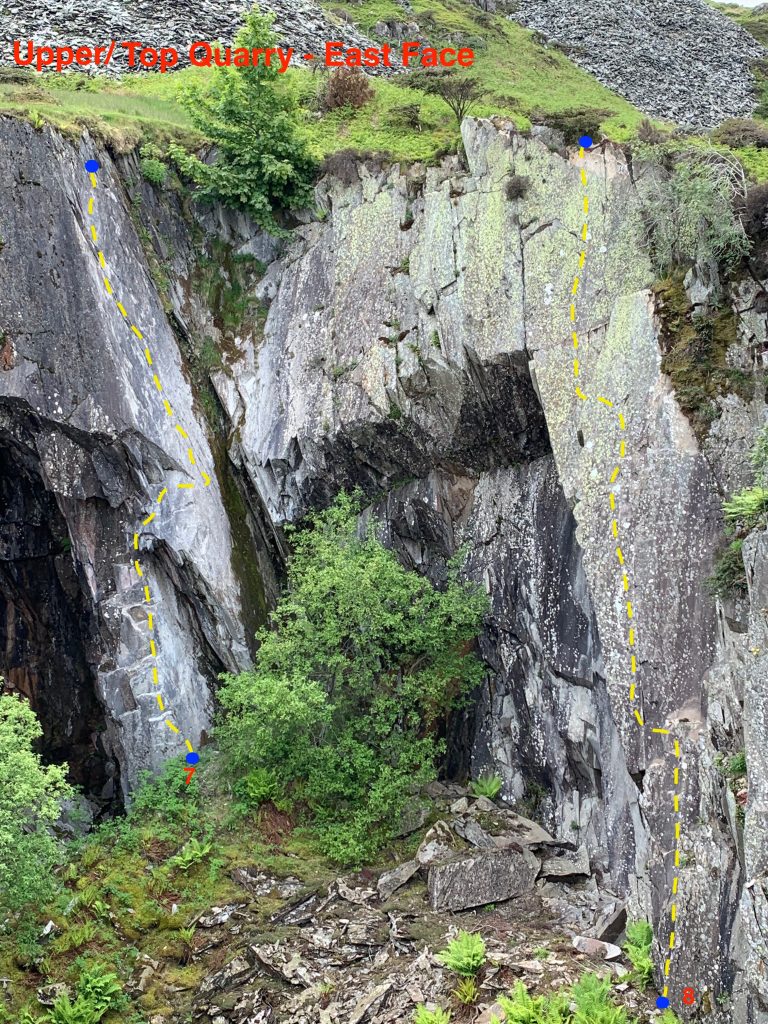 8. An excellent route that dries very quickly. Start at the base of the slab. Easily up to some ledges then step left and make delicate moves up a thin crack in the slab to reach better holds. Move up and pull leftwards around the arête into a short groove. Climb the middle of the slab to lower offs (or pull over to belay at the juniper tree).