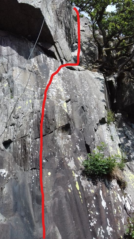 A fine diagonal line that dissects the full length of the crag. Start at a black wall directly below the large overhang. Delicate climbing rightwards up the slabs leads to a large ledge and oak tree (possible belay). Follow the corner crack above that is constantly attempting to eject you.