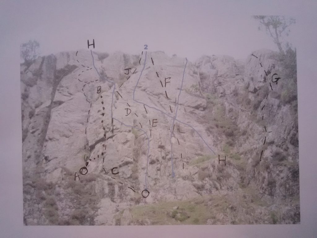 Posted by: Martin Scrowston, 01.06.201825.05.2018, M Scrowston PC Bennett An ingenious line that avoids the vegetated chimney crack with a steep start and exit. Start 1m left of Trambiolina at an obvious narrow green chimney. Climb the right edge of the narrow chimney for 6m until a bridging step across left gains access to a good ledge (possible belay) Follow the broken slab above to its apex, a committing step up and left leads to a short diagonal crack through the final headwall. Line 1 on the photodiagram, Trambiolina is Line 3