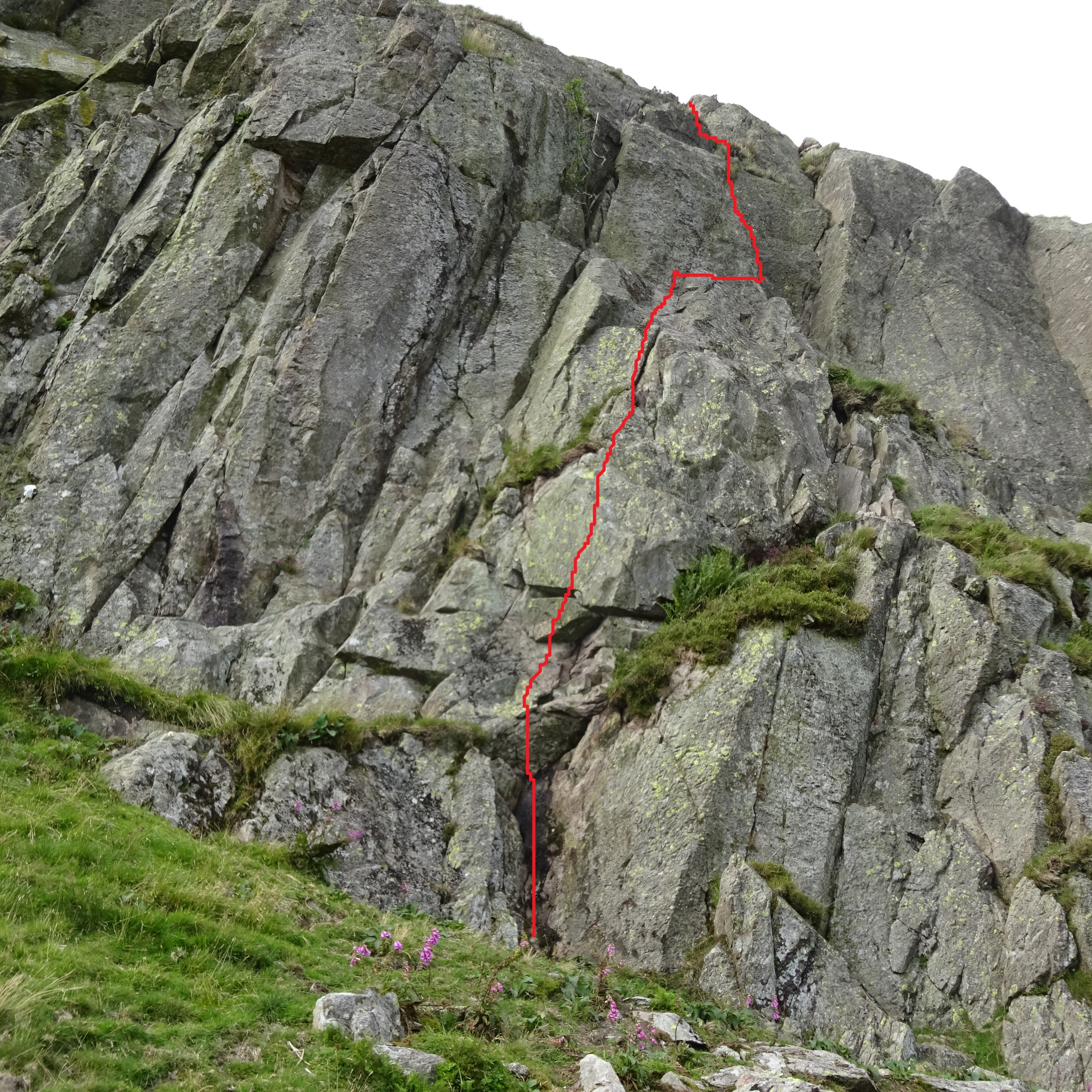 Posted by: Martin Scrowston, 18.08.202014.08.2020, Martin Scrowston, Freya Scrowston Start three metres left of Sky Waller at a short V groove. Climb the groove moving right to gain a hanging slab, follow the slab, and the right trending cracks above that terminate at a steep headwall. A hand traverse right gives access to the right hand arête, climb this (crux) to finish up the broken wall above.