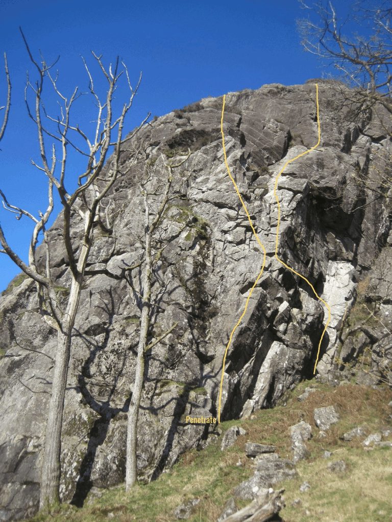 42m. 4b. Climb the corner pull up left to access a long leftwards sloping ledge. An exposed traverse left leads to a large ledge on the arete ( junction with Penetrate ) Follow the arete up to a large detached block below a short slab. Climb the slab to finish up a fine serpentine crack.