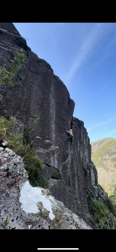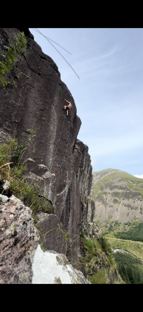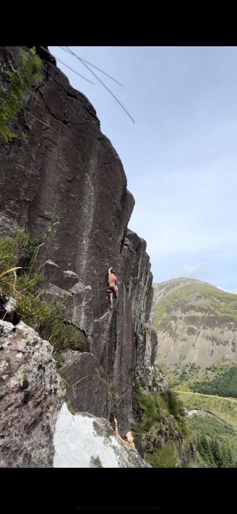 Climb the groove / flake, bridge out right onto the ramp. Using the shallow mono above (dmm no 4 half nut in keyhole below) make a hard move right onto the wall. Using undercuts and a fingery sequence to boldly climb to a junction with John Wayne. Finish up this.