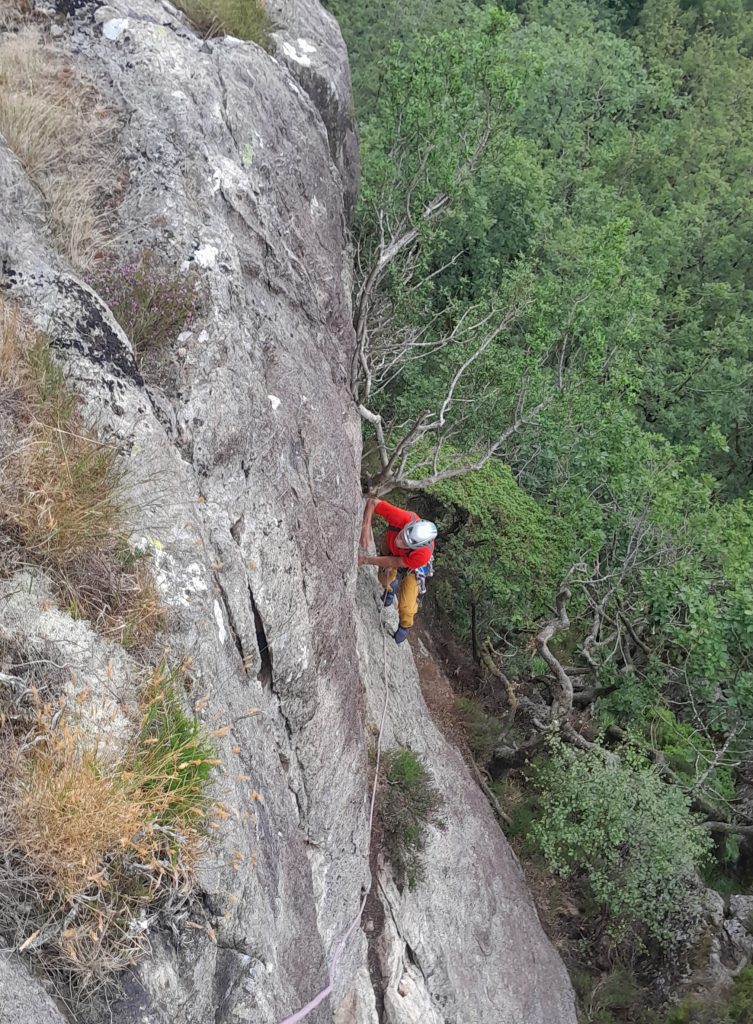 Good climbing with a choice exits that seeks out the slab on the left of the buttress.