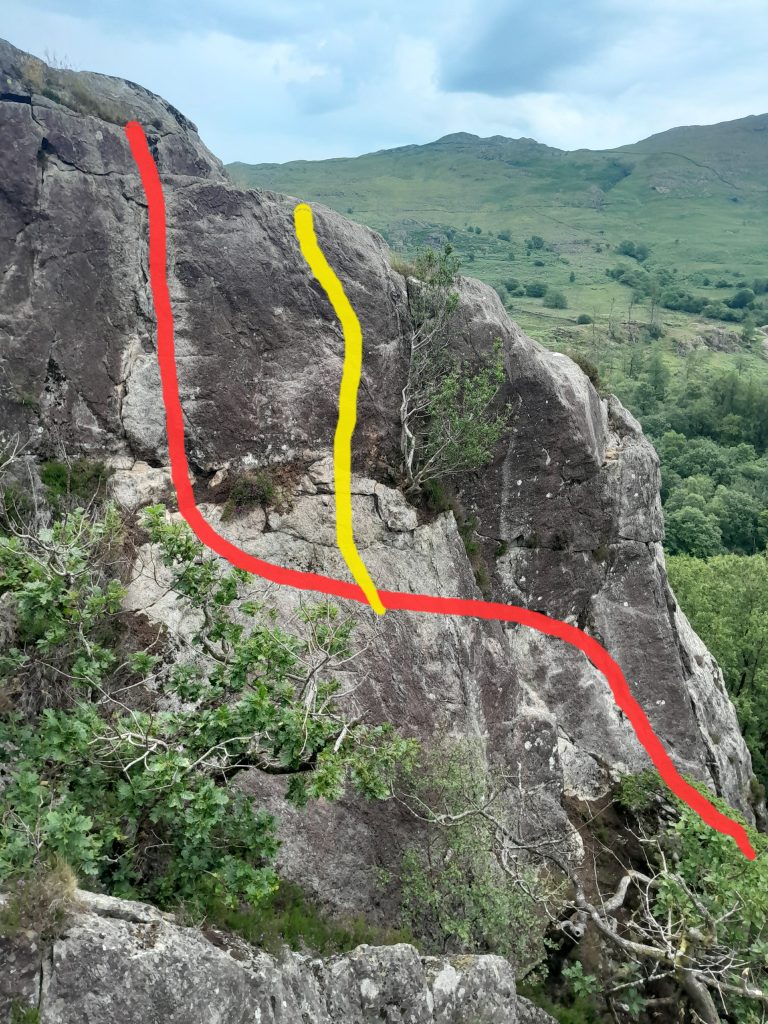 Start left of a multi-stemed oak tree in the centre of the buttress. Pass the tree on the left then a holly on the right to gain twin cracks. Ascend the cracks and wall above moving left to the arete. Move up and left to a horizontal hand traverse crossing a groove to the slab. A diagonally traverse leads up to finish via a vertical crack, or alternatively a direct finish passing left of a small holly tree (5a).