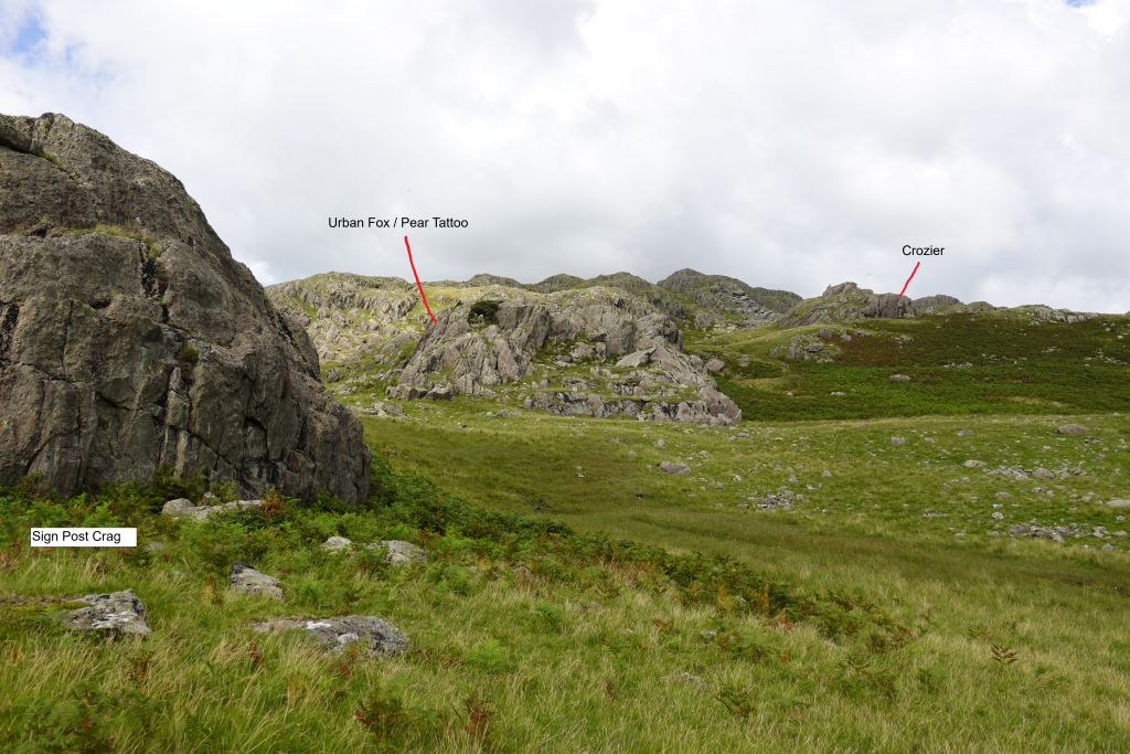NNE of the main crag, 70m uphill, is a small outcrop.